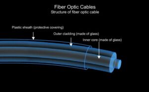 3D model showing the structure of an optical fiber. Inner Core or Core where 90% of the light propagates and Outer Cladding. The third layer is a Plastic Sheath which serves as a protective layer. Courtesy of Goalfinder.