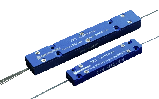 DK Photonics 7x1 multimode pump combiner combines 7 multimode lasers power to create a high power output with consigned fibers. It features exceptional optical characteristics. The output fiber can be transmitting energy fiber as the energy synthesis, it also can be no core fiber or LMA double clad fiber, which people can splice with match doped LMA double cladding fiber. DK Photonics’ Multimode Pump Combiners offer efficient power transfer for high power applications like direct diode materials processing and pump cascading with a maximum conservation of brightness. The Multimode Combiners can be designed to meet a wide range of power handling configurations, number of input fibers and adaptation to different fiber types.