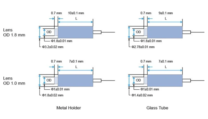 | Package Dimensions (mm): | 1.8(OD) Lens 3.2x10 Metalholder (P1) or 2.78x9.0 Glasstube (P2), 1.0(OD) Lens 1.8x7 Metalholder (P3) or 1.4x7 Glasstube (P4) |