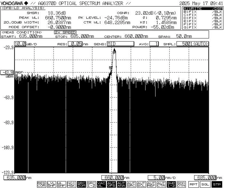 It is compatible with SM630-HP fiber, making it ideal for various optical instruments and lighting systems that require precise wavelength emission. This laser diode operates within a wavelength range of 652 to 670nm, with a typical operating wavelength at 660nm. It offers an optical output power of 30mW, suitable for applications needing moderate power levels.