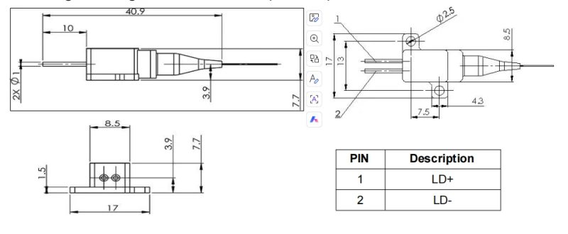 The power conversion efficiency is up to 45%, and the wavelength temperature coefficient is 0.3nm/℃. The fiber specifications include a 1.2m length, with options for Null, FC/PC, or SMA905 connectors. The mechanical design of the BLD-F785-06-22N0 ensures easy integration and reliable operation. The laser is housed in a robust package with dimensions of 55.00mm x 19.40mm x 35.00mm. It requires a proper heatsink for thermal management and must be operated in a cleanroom atmosphere or dust-protected housing.