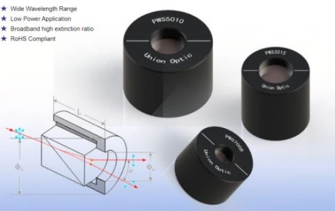 The Wollaston Polarizer is used for low power applications and has a wide wavelength range with broadband high extinction ratio.