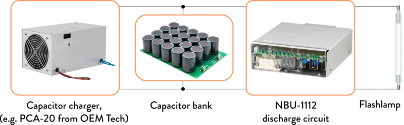 The NBU-1508 discharge circuit forms bell-shaped pulses of fixed length on a flashlamp. Typical applications are Q-switched Nd:YAG lasers or similar.